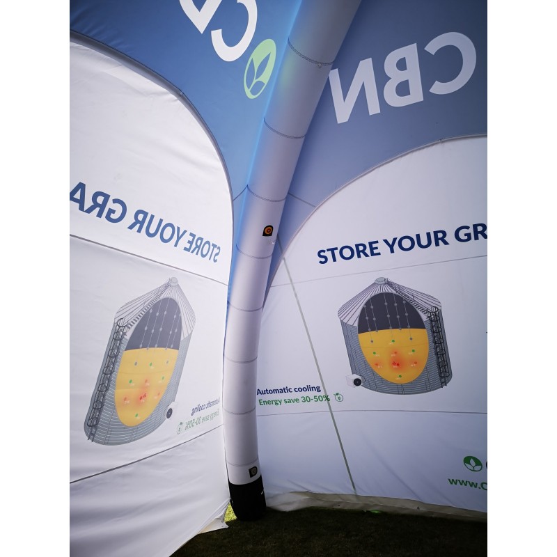 Cortul gonflabil personalizat ieftin Air Tent 5x5m se umfla cu ajutorul unei pompe electrice in mai putin de un minut iar structura ramane rigida si stabila, acest tip de cort nu necesita conectare permanenta la o priza de curent pentru ca structura gonflabila este ermetica datorita tuburilor din TPU din interiorul husei picioarelor. Acoperisul waterproof din poliester 230 gr se personalizeaza integral prin sublimare, laturile se pot inchide prin atasarea peretilor laterali, de la 1 pana la 4 pereti, pereti plini, pereti cu fereastra sau pereti cu usa sectionala sau usa tip rulou. Optional la baza fiecarui perete lateral se poate atasa o banda din pvc prevazuta cu capse metalice pentru a ancora peretele in pamant, cortul gonflabil se poate ilumina la interior.