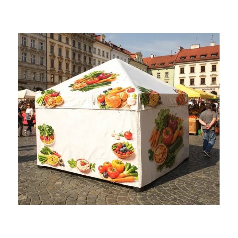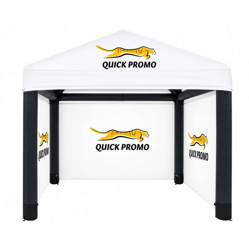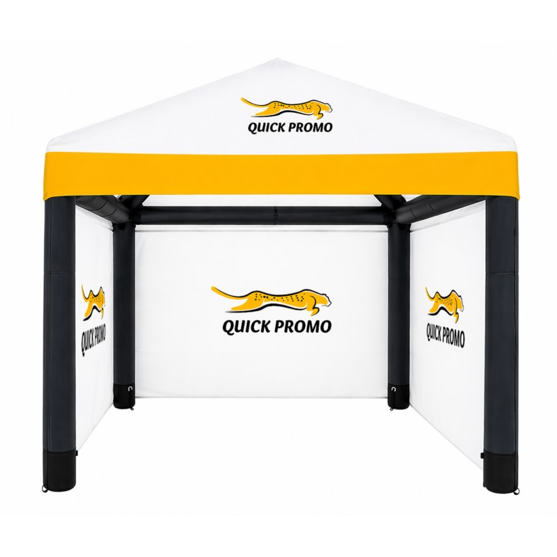 Peretii pot fi, de asemenea, imprimati, acestia se ataseaza cu velcro de acoperis. Personalizarea cortului gonflabil Air Square se face prin sublimare, ceea ce asigura detalii precise si culori vii. Designerii nostri pregatesc designul tiparit in consultare cu clientul, iar proiectul este inclus gratuit ca parte a serviciului complet.