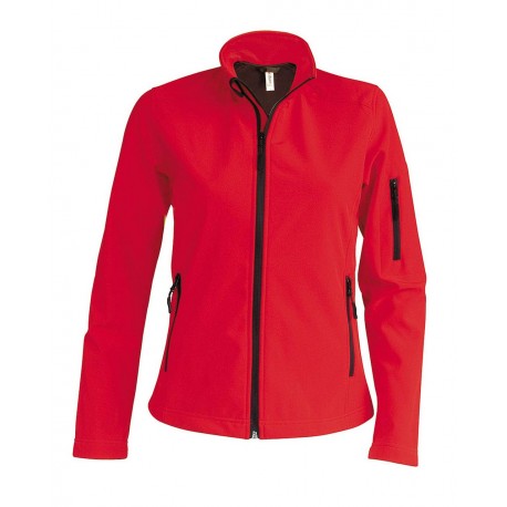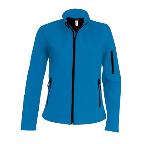 Jachetă damă Kariban Softshell 300g/m2, respirabilă până la 3000 g/m2/24h, rezistentă la apă până la 8000 mm, 3 straturi de țesătură, 95% poliester, 5% elastan la exterior, polar la interior. Jacheta este prevăzută cu fermoar frontal, doua buzunare laterale cu fermoar și un buzunar cu fermoar pe mâneca stângă.