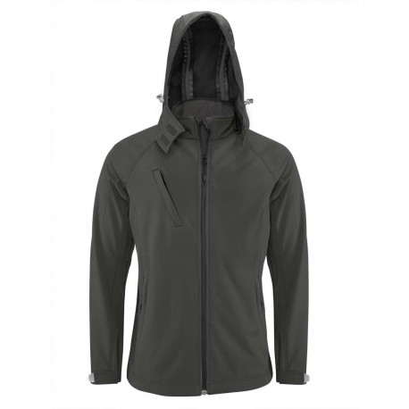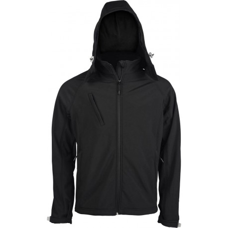 Jachetă softshell bărbați cu glugă Kariban din poliester 94% cu elastan 6%. Țesătură respirabilă până la 1000 g/m2 /24h, rezistentă la apă până la 5000 mm, strat interior din polar antiscămoșare, mâneci tip raglan, fermoar lung, 2 buzunare laterale cu fermoar, 1 buzunar cu fermoar la piept, glugă detașabilă cu șnur și închidere velcro, manșete reglabile cu velcro. 340 g/m2.