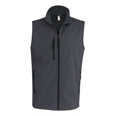 Vestă bărbați Softshell Kariban 300g/m2, respirabilă până la 3000 g/m2/24h, rezistentă la apă până la 8000 mm, 3 straturi de țesătură, 95% poliester, 5% elastan la exterior, polar la interior. Jacheta este prevăzută cu fermoar frontal, doua buzunare laterale cu fermoar și un buzunar frontal cu fermoar pe piept dreapta.